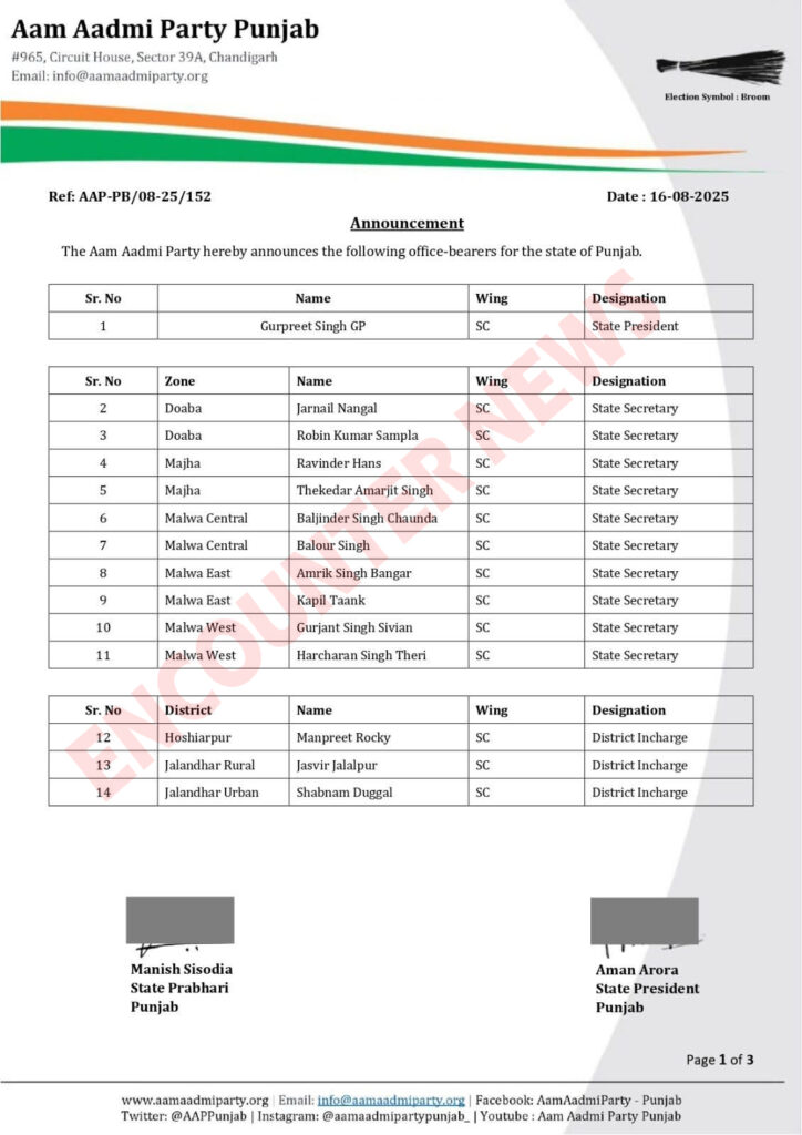 जालंधर, ENS: पंजाब में सभी पार्टियों ने ने 2027 विधानसभा चुनावों को लेकर तैयारिया शुरू कर दी है। हाल ही में जिला प्रधानों के चुनाव के लिए पार्टी हाईकमान ने संगठन सृजन अभियान के तहत 29 ऑब्जर्वर नियुक्त किए थे। वहीं अब आप पार्टी ने 11 स्टेट सैकेटरी और 3 डिस्टिक इंचार्ज नियुक्त किए है। जिसमें जालंधर से जरनैल, रोबिन सांपला को स्टेट सैकेटरी की जिम्मेदारी सौंपी गई है, वहीं जसवीर और शबनम को डिस्टिक इंचार्ज की जिम्मेदारी दी गई है। देखें लिस्ट