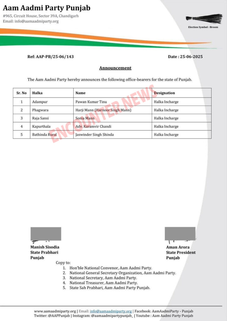 जालंधर, ENS: पंजाब में नए निर्वाचन क्षेत्र प्रभारियों को आम आदमी पार्टी ने नई जिम्मेदारियां सौंपने की घोषणा की है। जारी आदेशों के मुताबिक आदमपुर से पवन टीनू को हलका इंचार्ज नियुक्त किया गया। आप पार्टी ने 5 नेताओं को हलका इंचार्ज नियुक्त किया है। आप पार्टी ने आदमपुर, बठिंडा, फगवाड़ा, राजाझांसी और कपूरथला के नेताओं को हलका इंचार्ज नियुक्त किया है। जिसमें पवन कुमार टीनू, हरजी मान, सोनिया मान, एडवोकेट कर्मवीर सिंह और जसविंदर सिंह छिंदा शामिल है।