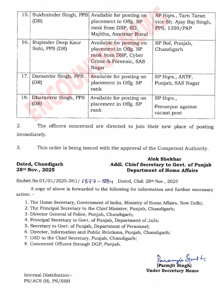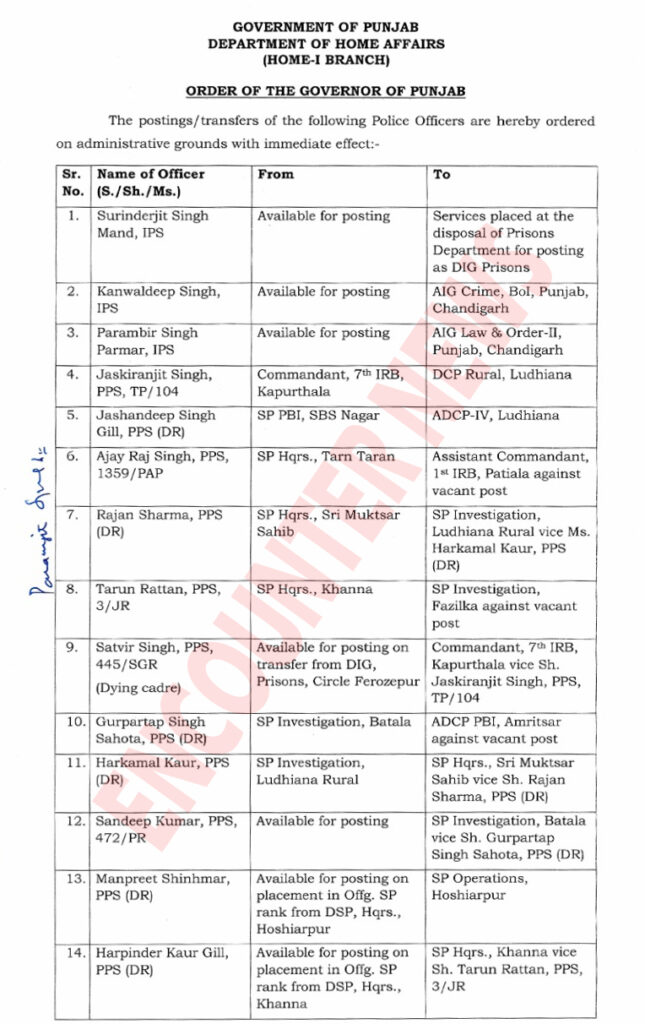 मोहालीः पंजाब सरकार की अगुवाई में अधिकारियों के तबादलों का दौर लगातार जारी है। अभी कुछ देर पहले 61 एसीपी और डीएसपी अधिकारियों के तबादलें किए गए थे। वहीं अब 16 आईपीएस और पीपीएस अधिकारियों के तबादलें किए गए। देखें लिस्ट