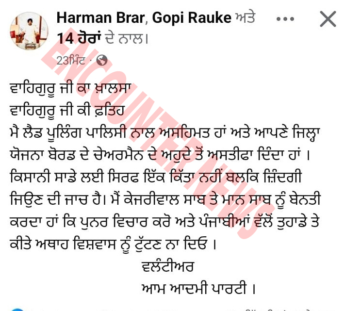 वहीं अब जिले में ‘आप’ पार्टी के पूर्व जिला प्रधान और जिला योजना बोर्ड के चेयरमैन हरमनजीत सिंह बराड़ दीदारे वाला ने अपने फेसबुक अकाउंट पर इसका विरोध करते हुए अपने पद से इस्तीफा दे दिया है। उन्होंने स्पष्ट लिखा है कि मैं इस नीति का विरोध करता हूं और एक किसान होने के नाते किसानों के साथ हूं तथा सरकार से इस मसले पर पुनर्विचार करने की अपील करता हूं।
