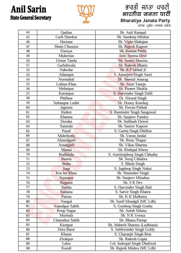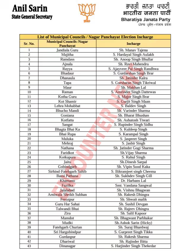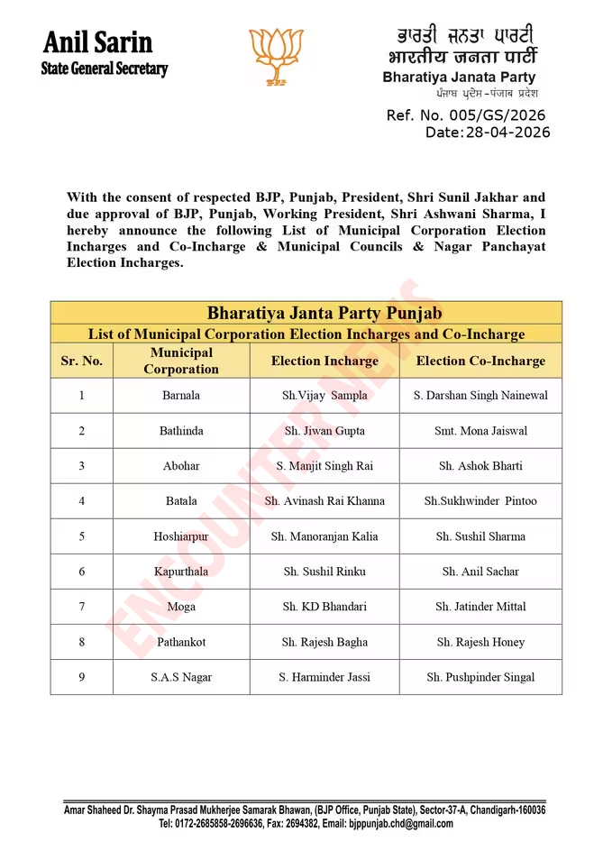 चंडीगढ़ः पंजाब में आगामी नगर निगम, नगर परिषद और नगर पंचायत चुनावों को देखते हुए भारतीय जनता पार्टी ने अपनी तैयारियां तेज कर दी हैं। इसी क्रम में पार्टी ने चुनाव प्रबंधन को मजबूत करने के लिए विभिन्न इंचार्ज और सह-इंचार्ज नियुक्त करने की घोषणा की है। पंजाब भाजपा द्वारा जारी इस सूची में नगर निगमों के साथ-साथ नगर परिषदों और नगर पंचायतों के लिए भी इंचार्ज और सह-इंचार्ज तैनात किए गए हैं।