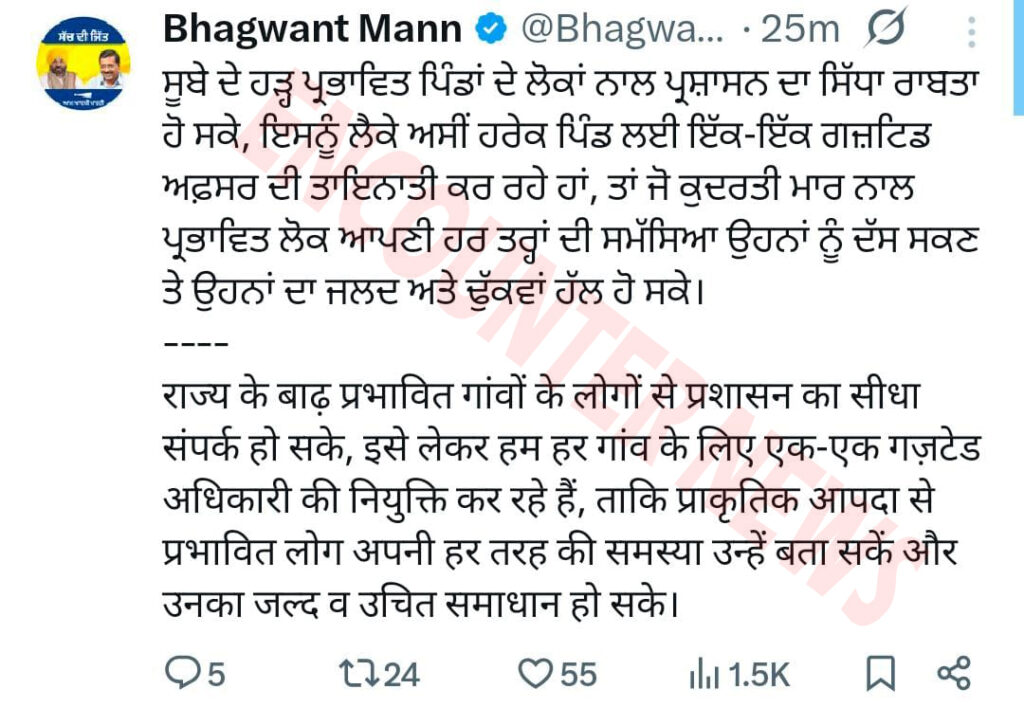 इसकी जानकारी उन्होंने सोशल मीडिया पर पोस्ट कर दी। राज्य के बाढ़ प्रभावित गांवों के लोगों से प्रशासन का सीधा संपर्क हो सके, इसे लेकर हम हर गांव के लिए एक-एक गज़टेड अधिकारी की नियुक्ति कर रहे हैं, ताकि प्राकृतिक आपदा से प्रभावित लोग अपनी हर तरह की समस्या उन्हें बता सकें और उनका जल्द व उचित समाधान हो सके। सतलुज ने फिरोजपुर के पल्ला मेघा गांव के पास सीमापार पाकिस्तान के गांव और पुलिस चौकी को डुबो दिया है। यहां तटबंध टूटने का भी खतरा बना हुआ है।