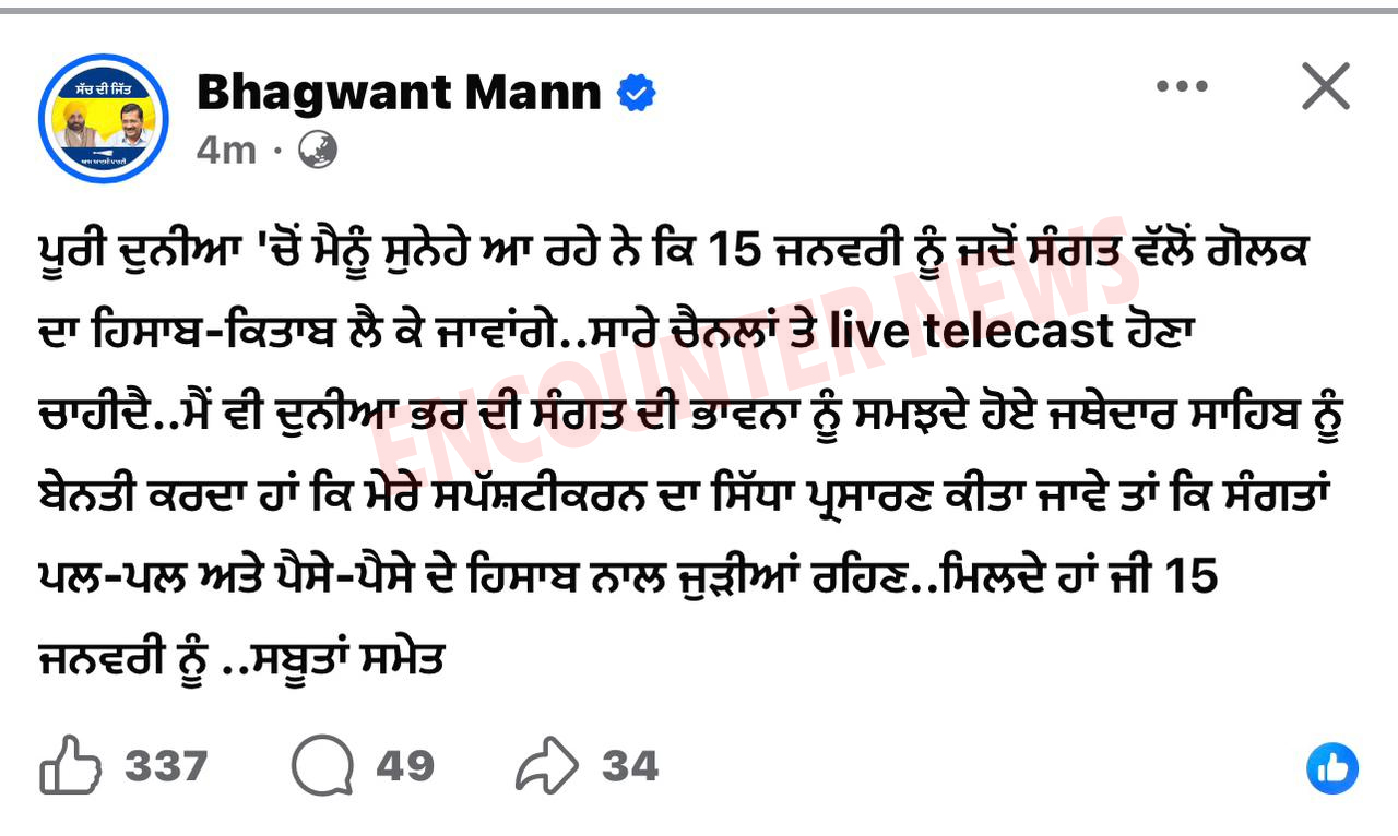 मान ने सोशल मीडिया पर लिखा- पूरी दुनिया से मुझे संदेश आ रहे हैं कि 15 जनवरी को जब संगत की तरफ से गोलक का हिसाब-किताब लेकर जाओगे तो इसका लाइव टेलीकास्ट होना चाहिए।” दूसरी ओर सीएम मान के इस बयान पर SGPC मेंबर गुरचरण सिंह ग्रेवाल ने कहा कि अकाल तख्त साहिब के जत्थेदार ने कोई चीज महसूस की हाेगी और जनता के बीच एतराज पाया गया, इसलिए मुख्यमंत्री को बुलाया। इस मामले को राजनीतिक रंग नहीं दिया जाना चाहिए। इसका कारण दुनिया को पता है, जो दस्तावेज अकाल तख्त जाएंगे, वह ऐतिहासिक होंगे। अकाल तख्त पर जा रहे हो तो शर्तें न लगाई जाएं।