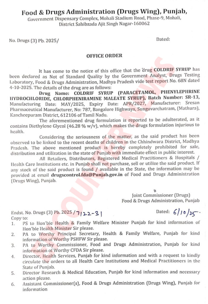 यह निर्णय फूड एंड ड्रग एडमिनिस्ट्रेशन (FDA) की रिपोर्ट के बाद लिया गया है। FDA के ज्वाइंट कमिश्नर (ड्रग्स) की ओर से जारी आदेश में बताया गया है कि इस सिरप के नमूनों में डायथिलीन ग्लाइकोल की मात्रा 46.2 प्रतिशत पाई गई है, जो मानव स्वास्थ्य के लिए अत्यंत हानिकारक मानी जाती है। पंजाब के FDA विभाग ने सभी फार्मासिस्ट, वितरक, डॉक्टरों और अस्पतालों को निर्देश दिए हैं कि अगर उनके पास यह दवा स्टॉक में है, तो तुरंत इसकी सूचना drugscontrol.fda@punjab.gov.in पर भेजें और इसे बिक्री या उपयोग से रोक दें।