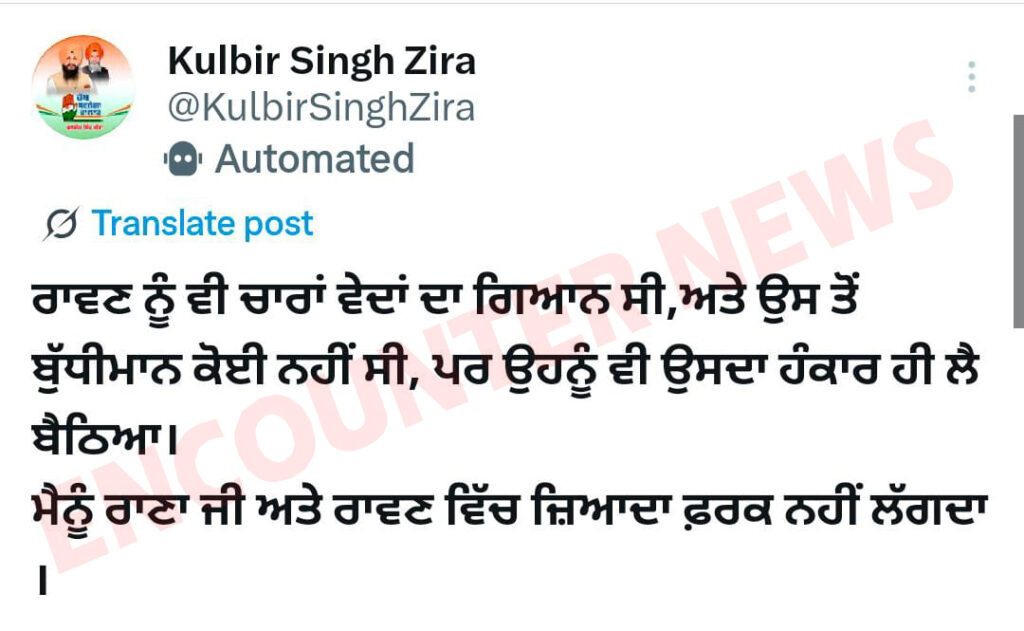 फिरोजपुरः पंजाब में 2027 विधानसभा चुनाव से पहले कांग्रेस में अंदरूनी कलह थमने का नाम नहीं ले रही। वहीं अब कांग्रेस के पूर्व विधायक कुलबीर जीरा ने कपूरथला से विधायक राणा गुरजीत सिंह की तुलना रावण से कर दी है। कुलबीर जीरा के इस बयान के बाद राजनीति गलियारे में हलचल बढ़ गई है। दरअसल, राणा गुरजीत ने इंटरव्यू में बिना नाम लिए कहा था कि उनके साथ जिसने भी पंगा लिया है, वह है नहीं।
