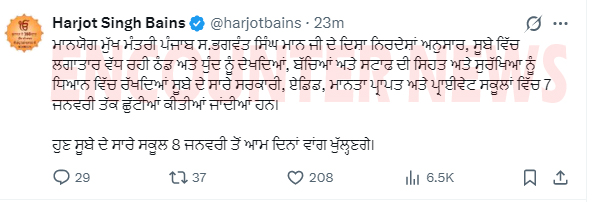 मोहालीः पंजाब में कोहरे का कहर जारी है। वहीं कोहरे के कारण लगातार हादसे भी हो रहे है। वहीं शिक्षा मंत्री ने बच्चों की सेहत का ध्यान रखते हुए स्कूलों में छुट्टियां बढ़ाने का ऐलान कर दिया है। उन्होंने एक्स के जरिए इसकी जानकारी दी है। शिक्षा मंत्री हरजोत बैंस ने लिखा है कि पंजाब में लगातार ठंड और कोहरा बढ़ रहा है। ऐसे में बच्चों और स्टाफ की सेहत का ध्यान रखते हुए सरकारी और प्राइवेट स्कूलों में 7 जनवरी तक छुट्टियां की जा रही है। जारी आदेशों के अनुसार 8 जनवरी को स्कूल खोले जाएंगे।