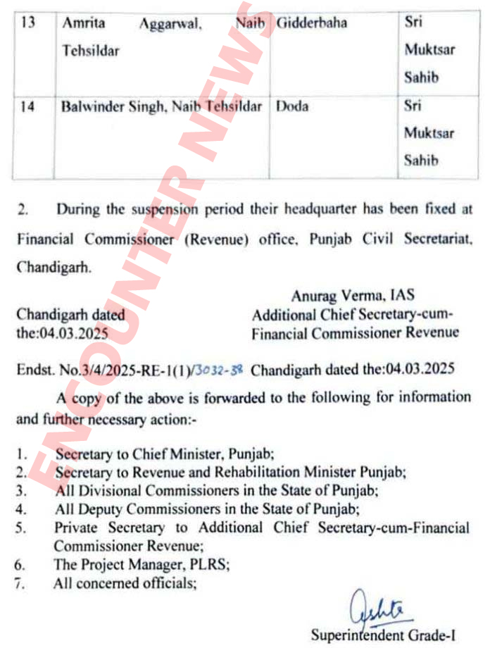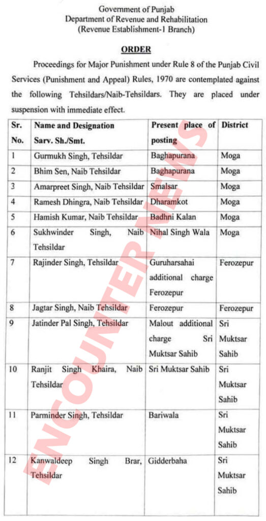 सस्पेंड किए गए अधिकारियों में गुरमुख सिंह तहसीलदार बाघापुराना (मोगा), भीम सेन नायब तहसीलदार (बाघापुराना) मोगा, अमरप्रीत सिंह नायब तहसीलदार समालसर (मोगा), रमेश ढींगरा नायब तहसीलदार (धर्मकोट) मोगा, हामिश कुमार नायब तहसीलदार बदनीकला, मोगा, सुखविंदर सिंह नायब तहसीलदार, मोगा, राजिंदर सिंह तहसीलदार, फिरोजपुर, जगतार सिंह नायब तहसीलदार, फिरोजपुर, जतिंदर पाल सिंह तहसीलदार, श्री मुक्तसर साहिब, रंजित सिंह खैहरा, नायब तहसीलदार, श्री मुक्तसर साहिब, अमृता अग्रवाल नायब तहसीलदार, श्री मुक्तसर साहिब और बलविंदर सिंह नायब तहसीलदार, श्री मुक्तसर साहिब शामिल है।