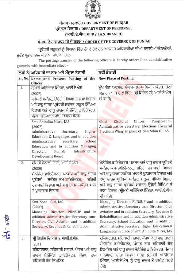 चंडीगढ़ः पंजाब सरकार में एक बार फिर से प्रशासनिक अधिकारियों का फेरबदल देखने को मिला। जारी आदेशों के अनुसार 3 आईएएस अधिकारियों के तबादलें किए गए। जिसमें आईएएस अनिदित्ता मितरा, आईएएस सोनाली गिरी और आईएएस गिरीष दयालन शामिल है। देखें लिस्ट