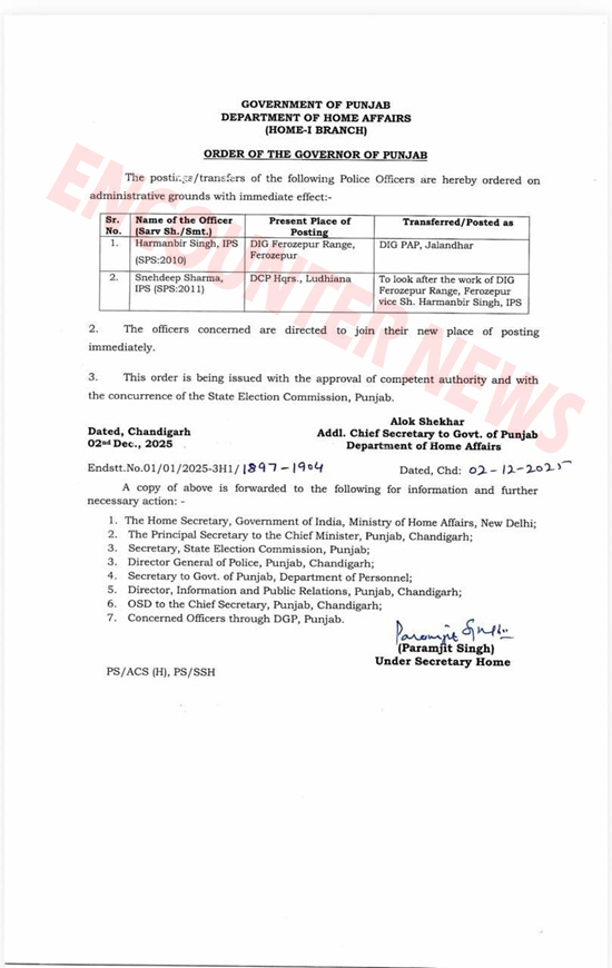 मोहालीः पंजाब में लगातार पुलिस अधिकारियों के तबादलें किए जा रहे है। वहीं आज जारी आदेशों के मुताबिक 2 आईपीएस अधिकारियों के तबादलें किए गए। जिसमें डीआईजी रेंज के अधिकारी हरमनबीर सिंह गिल को फिरोजपुर से जालंधर पीएपी में तैनात किया गया। वहीं डीसीपी रेंज के अधिकारी स्नेहदीप शर्मा को फिरोजपुर का चार्ज सौंपा गया। देखें लिस्ट