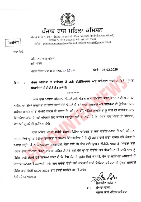लुधियानाः जिले के वकील हरीश राय ढांडा को लेकर पंजाब राज्य महिला आयोग ने एक्शन लिया है। इस मामले में महिला आयोग की चेयरपर्सन राज लाली ने पंजाब राज्य महिला आयोग अधिनियम, 2001 की धारा 12 के अंतर्गत अपनी शक्तियों का प्रयोग करते हुए कमिशनर ऑफ पुलिस को पत्र जारी करते हुए सूटो मोटो नोटिस जारी किया है।