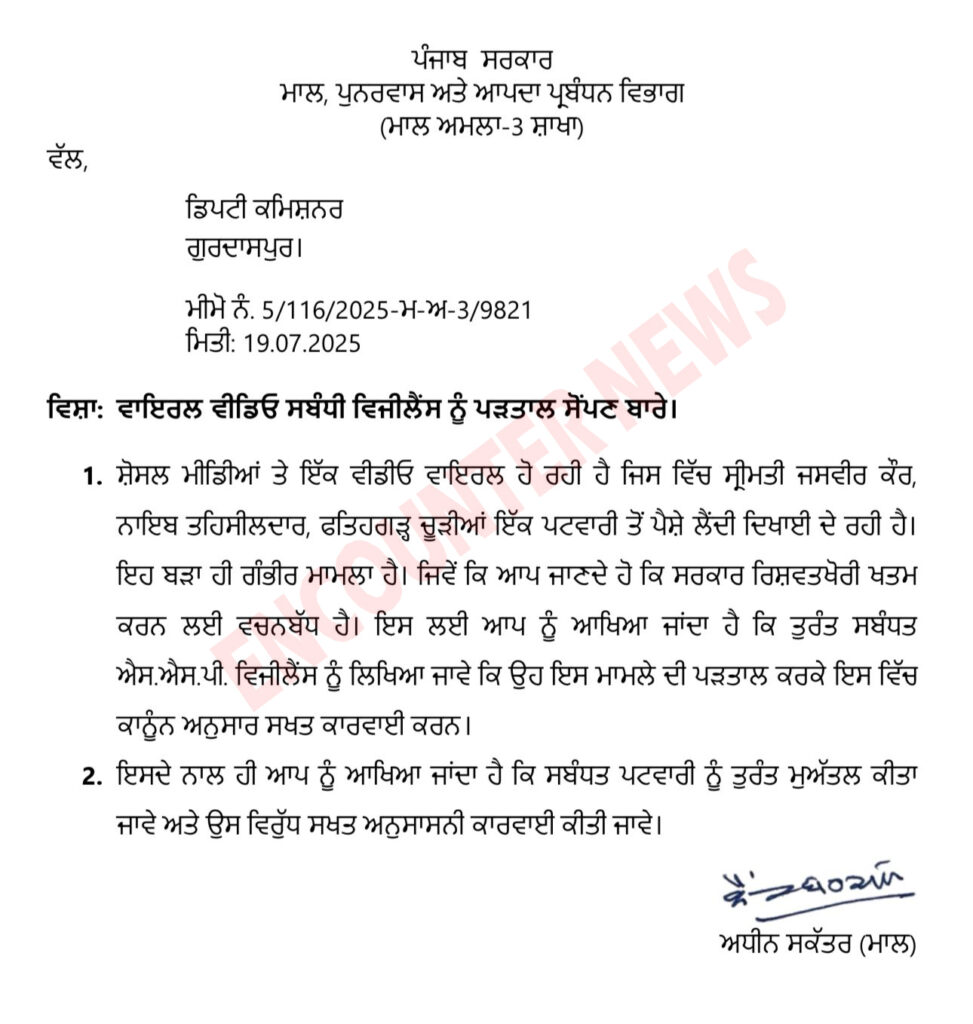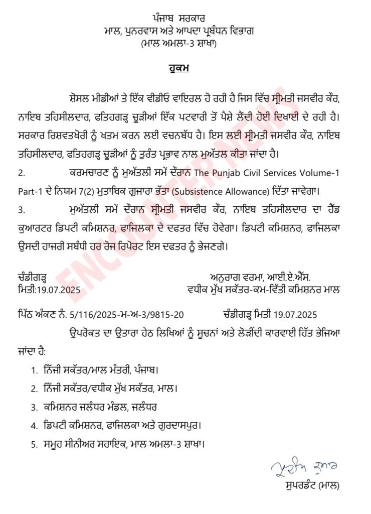 डीएस फाजिल्का अपनी हाजिरी रिपोर्ट रोजाना भेजेंगे। माल विभाग ने डीसी गुरदासपुर को भी पत्र लिखकर कहा है कि इस मामले की जांच करें और जांच के बाद कानून के अनुसार कार्रवाई के लिए एसएसपी विजिलेंस को पत्र लिखा जाए। यह भी आदेश दिया गया कि पटवारी को भी तुरंत निलंबित किया जाए और उनके खिलाफ अनुशासनात्मक कार्रवाई की जाए।
