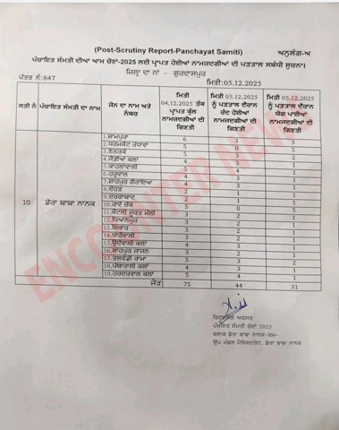 गुरदासपुरः विधानसभा क्षेत्र डेरा बाबा नानक के ब्लॉक डेरा बाबा नानक की ब्लॉक समिति सदस्यों के चुनाव के लिए पिछले दिनों विभिन्न पार्टियों के कुल 75 उम्मीदवारों ने नामांकन पत्र भरे थे, जिनमें से आज जांच के दौरान 44 उम्मीदवारों के नामांकन पत्र रद्द कर दिए गए।