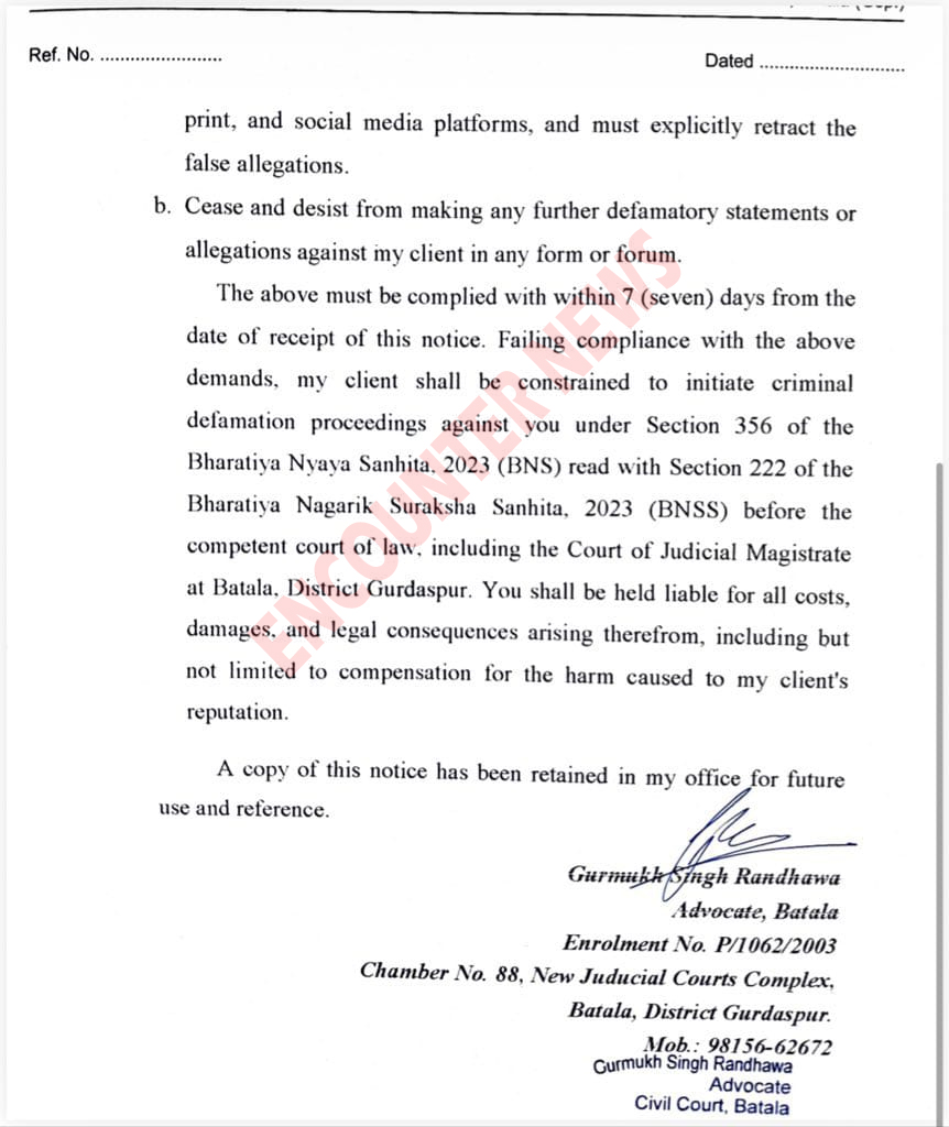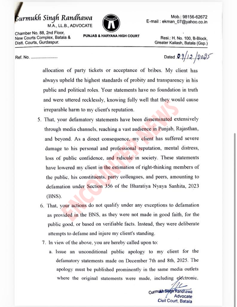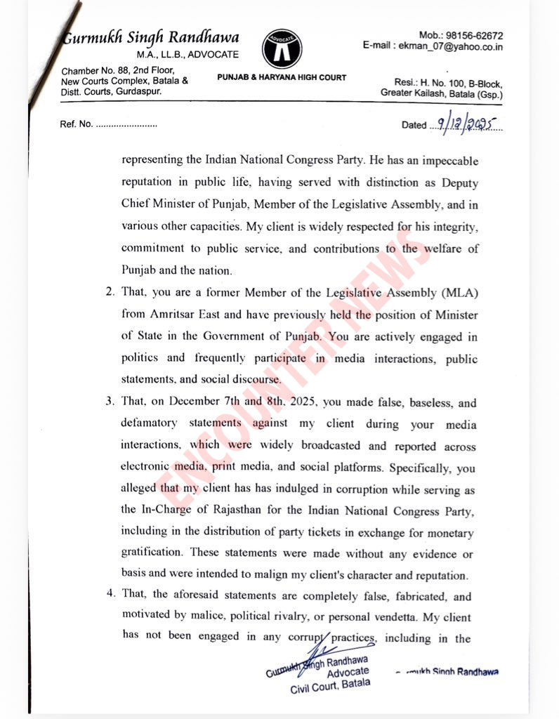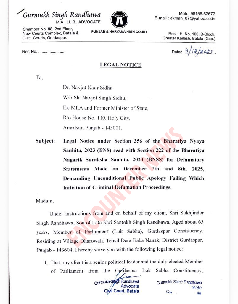 वहीं राजा वडिंग और प्रताप बाजवा पर तरनतारन उपचुनाव में कांग्रेस उम्मीदवार करणबीर सिंह बुर्ज से 5-5 करोड़ लेने के आरोप लगाए। जिसके बाद देर रात कांग्रेस ने नवजोत कौर सिद्धू को पार्टी से सस्पेंड कर दिया। वहीं अब रंधावा ने नवजोत कौर सिद्धू को लीगल नोटिस भेजा है। जिसमें कहा गया हैकि नवजोत कौर सिद्धू इस मामले में या तो माफी मांगे नहीं तो 7 दिनों में जवाब दें। ऐसा ना करने पर उनके खिलाफ कानूनी कार्रवाई की जाएगी।
