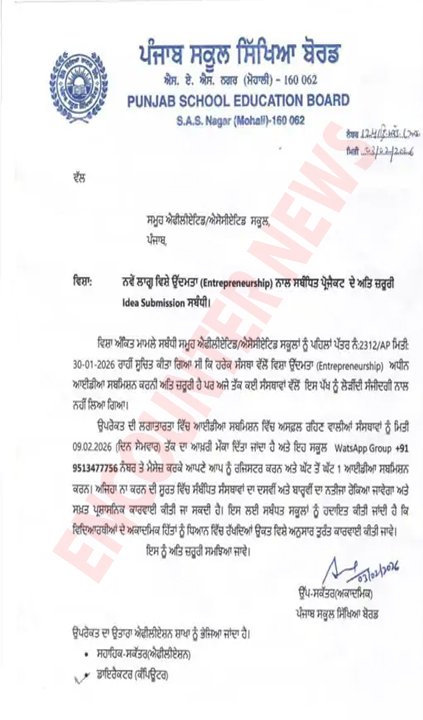 दरअसल, बोर्ड को शिकायत मिली थी कि बड़ी संख्या में स्कूल प्रिंसिपलों ने अब तक अपने स्कूल की ओर से बिज़नेस आइडिया सबमिट नहीं किए हैं, जबकि यह प्रोजेक्ट छात्रों में उद्यमिता और बिज़नेस स्किल्स विकसित करने के उद्देश्य से शुरू किया गया था। पंजाब स्कूल शिक्षा बोर्ड ने एफिलिएटेड व एसोसिएटेड स्कूल प्रिंसिपलों को कहा है कि 9 फरवरी 2026 तक सभी स्कूल प्रिंसिपल्स स्टूडेंट्स से बिजनेस आइडिया बोर्ड को भेज दें।