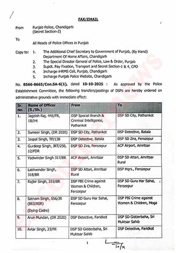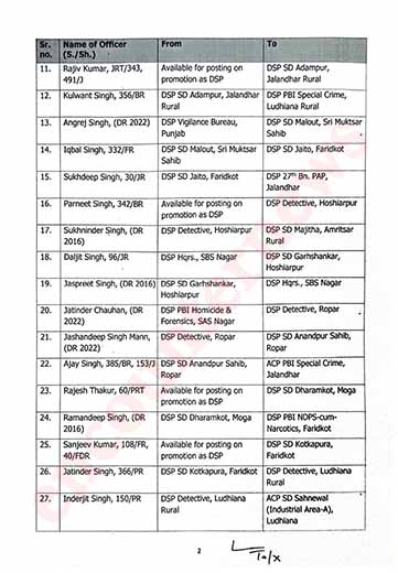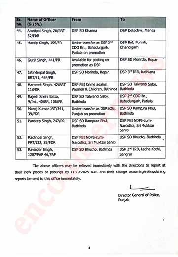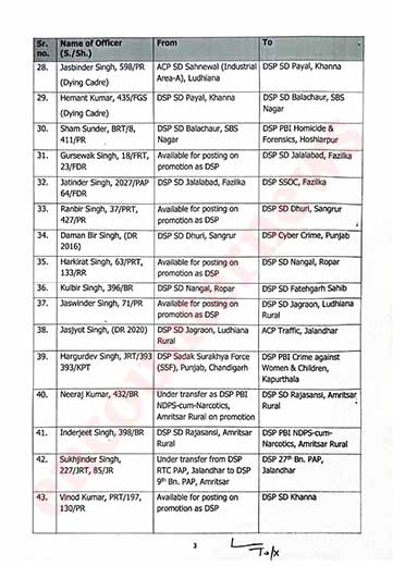 चंडीगढ़: राज्य सरकार ने पंजाब पुलिस मे तबादलों का दौर जारी कर दिया है। हाल ही मे SP और DSP स्तर के तबादलों के बाद अब 53 DSP के स्टेशंस को बदल दिया गया है। निचे दी गई लिस्ट मे ट्रांसफर की कॉपी मौजूद है।