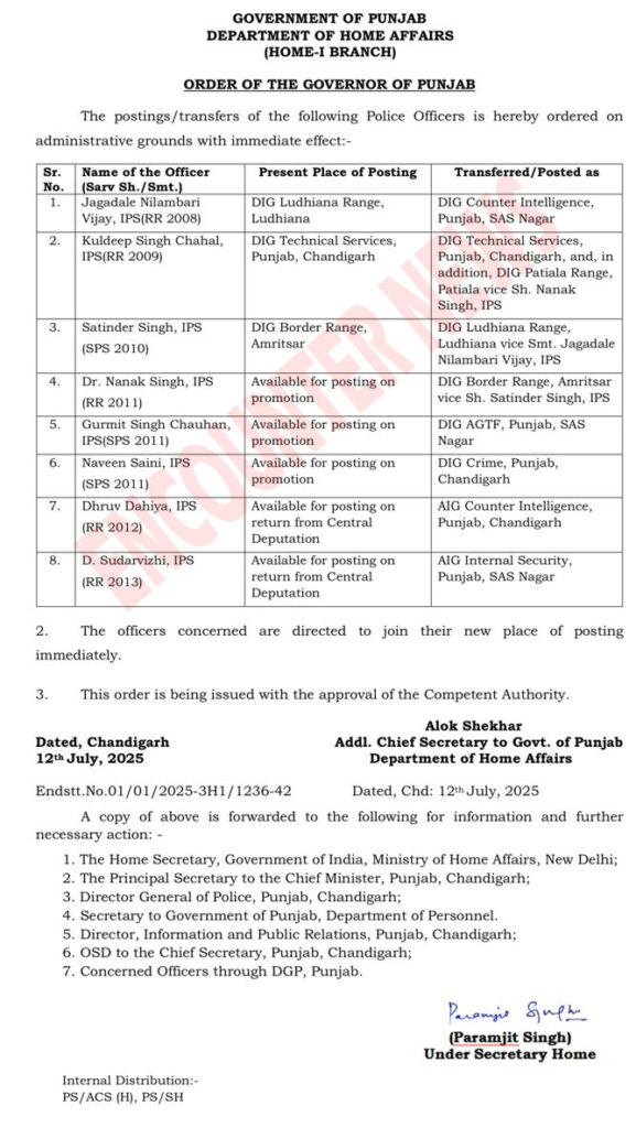 मोहाली: पंजाब में पुलिस अधिकारियों के लगातार तबादलें हो रहे है। वहीं आज जारी आदेशों के मुताबिक बड़ा प्रशासनिक फेरबदल किया गया है। आदेशों के अनुसार 8 IPS अफसरों के तबादले के आदेश जारी किए हैं। देखें लिस्ट