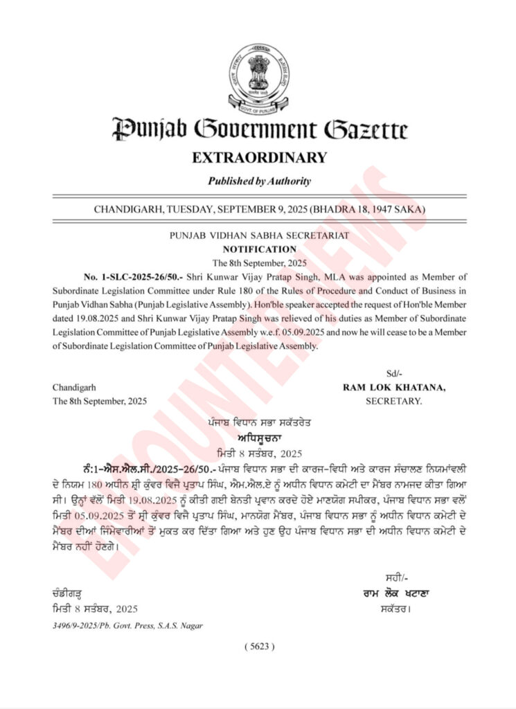 लेकिन 19 अगस्त को विधायक द्वारा किए गए अनुरोध को स्वीकार करते हुए स्पीकर पंजाब विधानसभा ने कुंवर विजय प्रताप सिंह विधायक को 5 सितम्बर से अधीनस्थ विधायी समिति के सदस्य की जिम्मेदारियों से मुक्त कर दिया और अब वह पंजाब विधानसभा की अधीनस्थ समिति के सदस्य नहीं होंगे।