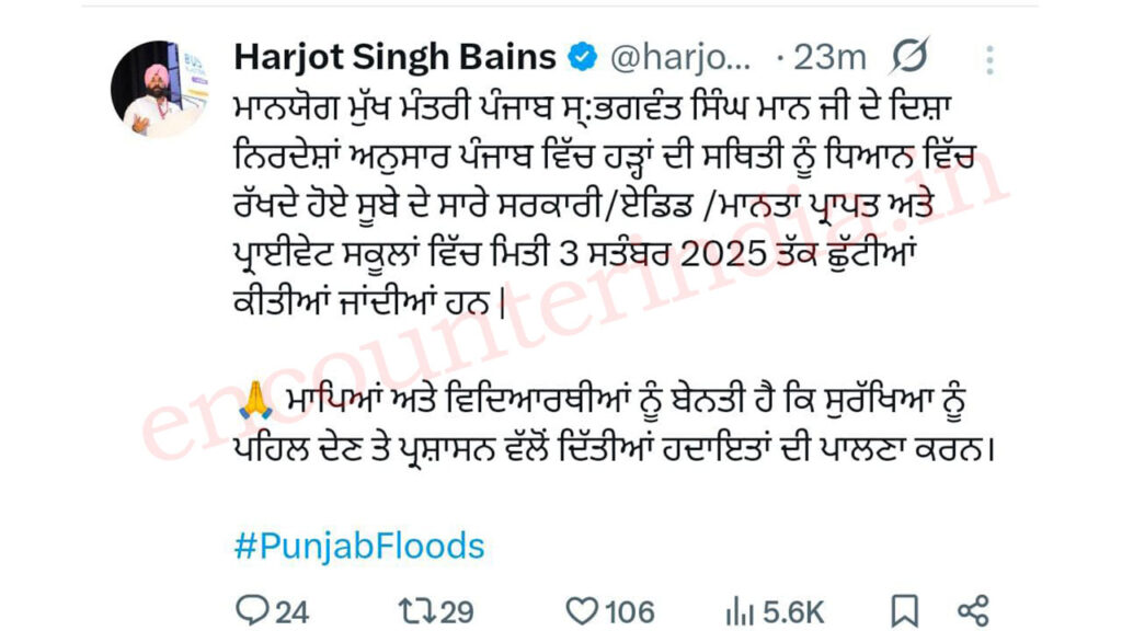 मंत्री हरजोत सिंह बैंस ने लिखा कि ”माननीय मुख्यमंत्री पंजाब भगवंत सिंह मान जी के दिशा-निर्देशों के अनुसार पंजाब में बाढ़ की स्थिति को देखते हुए राज्य के सभी सरकारी/सहायता प्राप्त/मान्यता प्राप्त और निजी स्कूलों में 3 सितंबर 2025 तक छुट्टियां की जाती हैं। अभिभावकों एवं विद्यार्थियों से अनुरोध है कि वे सुरक्षा को पहल दें तथा प्रशासन द्वारा दी गई हिदायतों की पालना करें। गौतरलब है कि इससे पहले पंजाब में बाढ़ के कारण 31 अगस्त तक छुट्टियां घोषित की गई थी, जिन्हें अब बढ़ा दिया गया है।