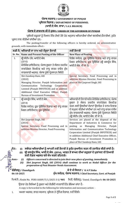 मोहालीः पंजाब में लगातार अधिकारियों के तबादलें किए जा रहे है। वहीं आज जारी आदेशों के मुताबिक 2 आईएएस अफसरों के तबादले किए गए। आदेशों के अनुसार आईएएस जसप्रीत सिंह को पंजाब सूचना व संचार तकनीक कॉर्पोरेशन लिमिटेड का मैनेजिंग डायरेक्टर बनाया गया है। वहीं अब आईएएस संदीप हंस फूड प्रोसेसिंग विभाग के विशेष सचिव की जिम्मेदारी के अलावा फूड प्रोसेसिंग मिशन के डायरेक्टर की भी जिम्मेदारी संभालेंगे। इससे पहले यह जिम्मेदारी आईएएस जसप्रीत सिंह के पास थी। देखें लिस्ट