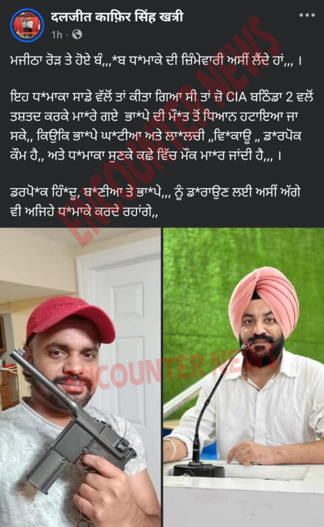 वहीं दूसरी ओर दलजीत काफिर सिंह खत्री ने घटना की जिम्मेवारी ली है। जिसमें कहा गया है कि मजीठा रोड़ पर हुए बम धमाके की वह जिम्मेदारी लेते है। धमाका बठिंडा साआईए-2 की ओर से तश्दत करके मारे गए भापे की मौत से ध्यान हटाया जा सके। आगे लिखा है कि क्योंकि भापे घटिया और लालची लोग है। हम आगे भी यह धमाके करते रहेंगे।