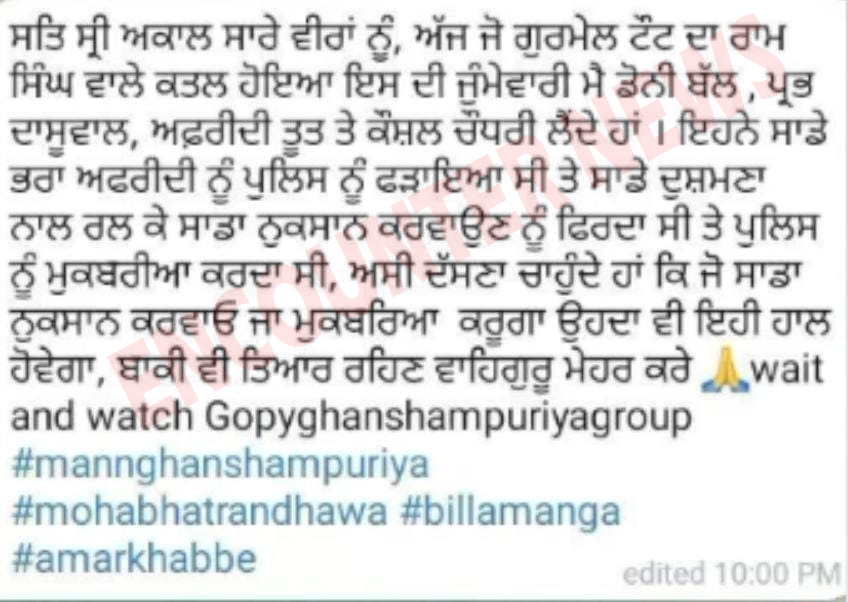 आगे लिखा है कि इन लोगों ने हमारे भाई अफ़रीदी को पुलिस को पकड़वाया था और हमारे दुश्मनों के साथ मिलकर हमारा नुकसान करवाने की फिराक में थे और पुलिस को मूकबिरीया कर रहा था। हम यह कहना चाहते हैं कि जो हमारा नुकसान कराएगा या मज़बूत करेगा, उसका भी यही हाल होगा। बाकी भी तैयार रहो। वाहीगुरु मेहर करें, वेट एंड वॉच।