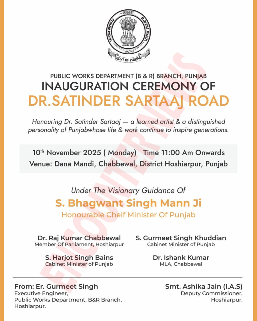 मोहाली: पंजाब में मशहूर पंजाबी गायक सतिंदर सरताज के नाम पर सरकार द्वारा सड़क का नाम रखा जा रहा है। इसको लेकर पंजाब सरकार की ओर से नेटिफिकेशन भी जारी कर दिया गया है। जारी नोटिफिकेशन के अनुसार मशहूर पंजाबी गायक और कलाकार डॉ. सतिंदर सरताज के सम्मान में लोक निर्माण विभाग सड़क का नाम रखने जा रही है। इस सड़क का उद्घाटन समारोह 10 नवंबर 2025 (सोमवार) को सुबह 11 बजे दाना मंडी, चब्बेवाल, ज़िला होशियारपुर में किया जाएगा।