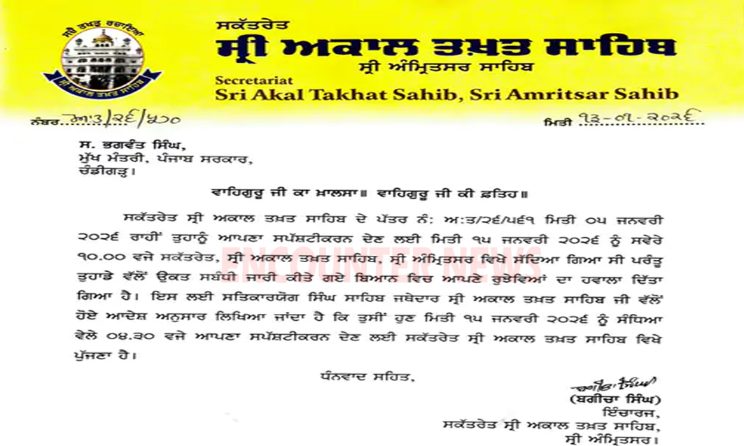 बता दें कि सीएम भगवंत मान ने कहा था कि वह नंगे पैर अकाल तख्त पर जाएंगे। उन्होंने जत्थेदार से विनती भी की थी कि जब वह सबूतों समेत गोलक का हिसाब-किताब दें तो इस पूरे मामले का लाइव टेलीकास्ट कराया जाए। हालांकि इसको लेकर अभी जत्थेदार की तरफ से इसको लेकर कोई बयान जारी नहीं किया गया है। चूंकि सीएम अमृतधारी सिख नहीं हैं, इसलिए उन्हें अकाल तख्त की फसील की जगह सचिवालय में पेश होने के लिए कहा गया है।