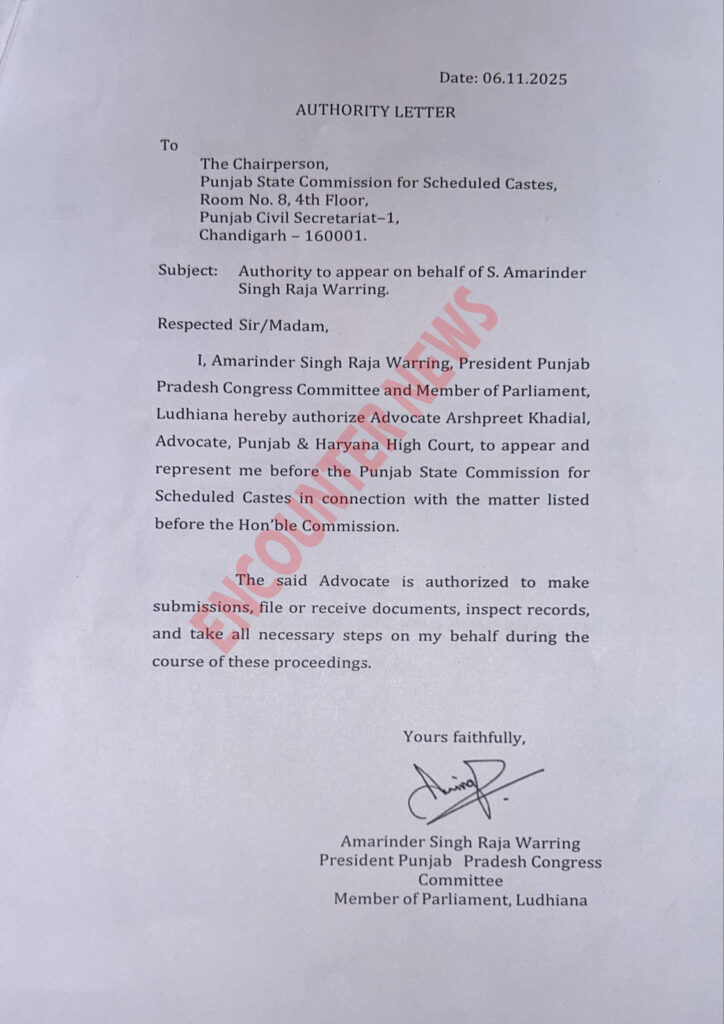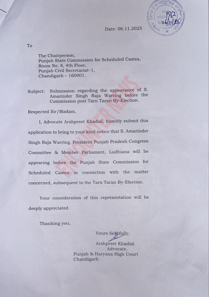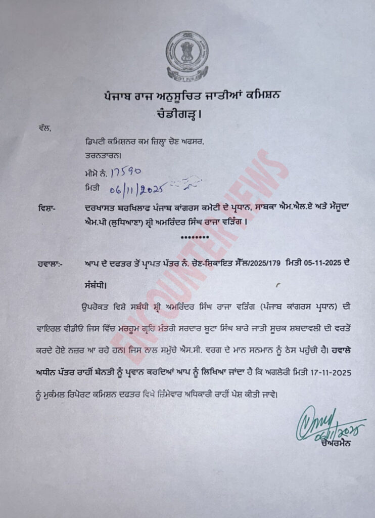 वहीं जिला चुनाव अधिकारी, तरनतारन ने पंजाब राज अनुसूचित जातियों आयोग के समक्ष पेश होने से छूट मांगी है। पंजाब राज अनुसूचित जातियों आयोग ने एसएसपी कपूरथला से रिपोर्ट की कॉपी मांगी है। एडवोकेट अर्शप्रीत सिंह खडियाल ने अमरिंदर सिंह राजा वडिंग के पक्ष में पेश होकर कहा कि उन्होंने स्व. गृह मंत्री बूटा सिंह के बारे में की गई टिप्पणियों को लेकर पंजाब राज अनुसूचित जातियों आयोग के समक्ष तलब किया था।