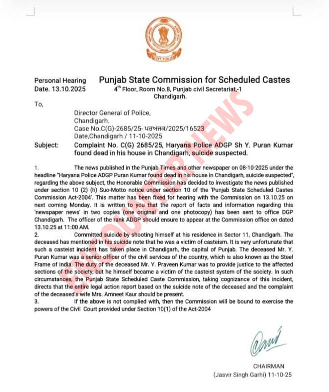 जिस पर उन्होंने कार्रवाई करते हुए चंडीगढ़ के पुलिस महानिदेशक (DGP) को इस मामले और मृतक अधिकारी के सुसाइड नोट तथा उनकी पत्नी अमनीत कौर द्वारा पंजाब राज्य अनुसूचित जाति आयोग को 13 अक्टूबर, 2025 को दी गई शिकायत पर अब तक की गई कार्रवाई की रिपोर्ट एडीजीपी स्तर के अधिकारी के माध्यम से प्रस्तुत करने के निर्देश दिए हैं। इसके साथ ही पंजाब राज्य अनुसूचित जाति आयोग के चेयरमैन जसवीर सिंह गढ़ी भी सोमवार 13 अक्टूबर 2025 को पीड़ित परिवार के घर जाएंगे।