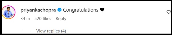 परिणीति की इस पोस्ट पर बहन प्रियंका चोपड़ा ने भी कमेंट करते हुए दोनों को बधाई दी है।