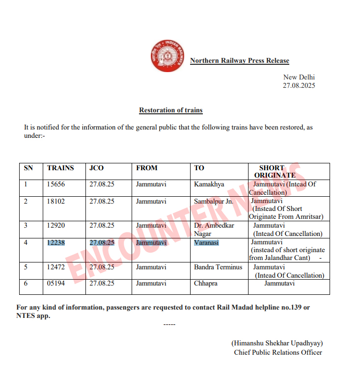 दूसरी ओर पंजाब में नार्थ रेलवे की ओर से जारी आदेशों के अनुसार 6 ट्रेनों में 3 ट्रेनों को कैंसिल कर दिया गया है। जारी आदेशों को अनुसार 15656 Jammutavi Kamakhya, 12920 Jammutavi Dr. Ambedkar Nagar और 12472 Jammutavi Bandra Terminus ट्रेन को 27 अगस्त तक कैंसिल कर दिया गया है। वहीं 18102 Jammutavi Sambalpur Jn. और 12238 Jammutavi Varanasi को शार्ट टर्निमेट कर दिया गया है।
