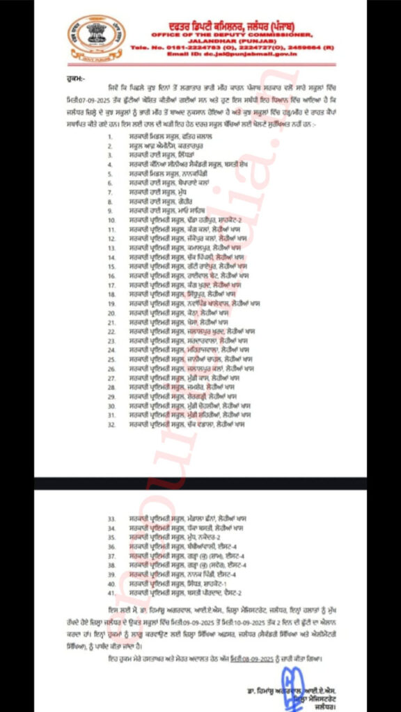 आज पटियाला में 43 स्कूल डिप्टी कमिश्नर द्वारा बंद करने के आदेश दिए गए। वहीं अब जालंधर में बारिश के कारण स्कूलों की इमारतों को नुकसान पहुंचने को लेकर डीसी डॉ. हिमांशु अग्रवाल ने जिले के 41 स्कूलों में 9 और 10 सितंबर को छुट्टी का ऐलान किया है। हालांकि बाकी सभी स्कूल रूटीन की तरह खुलेंगे।
