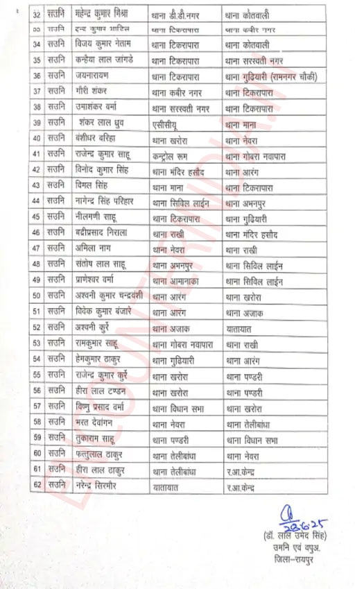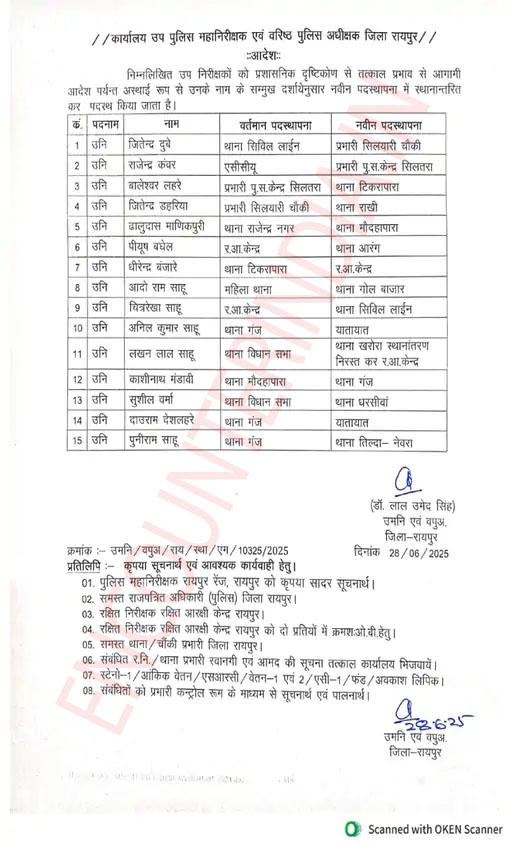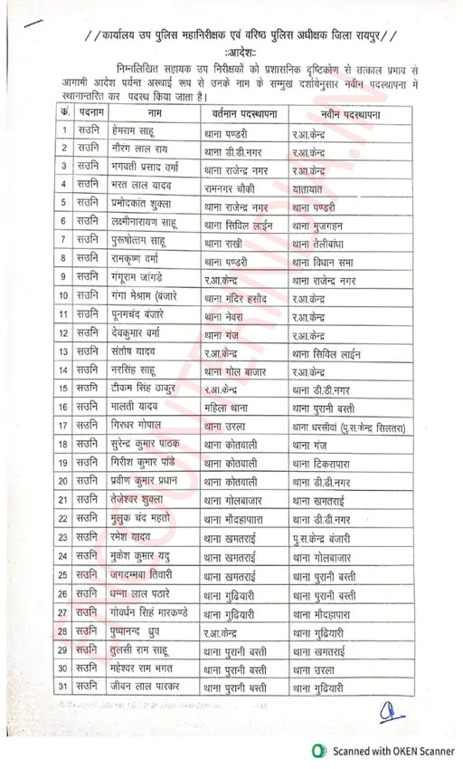 रायपुर: जिले के SSP ने पुलिस प्रशासन मे बड़े फेरबदल के किये है। जानकारी के अनुसार यह आदेश एसपी डॉक्टर लाल उमेद सिंह के हस्तक्षेप से जारी किये गए है । जिसमे 15 सब इंस्पेक्टर और 62 ASI के ट्रांसफर कर कईयो के थाने बदले गए हैं और कई पुलिस कर्मियों को लाइन मे भेज दिया गया है।