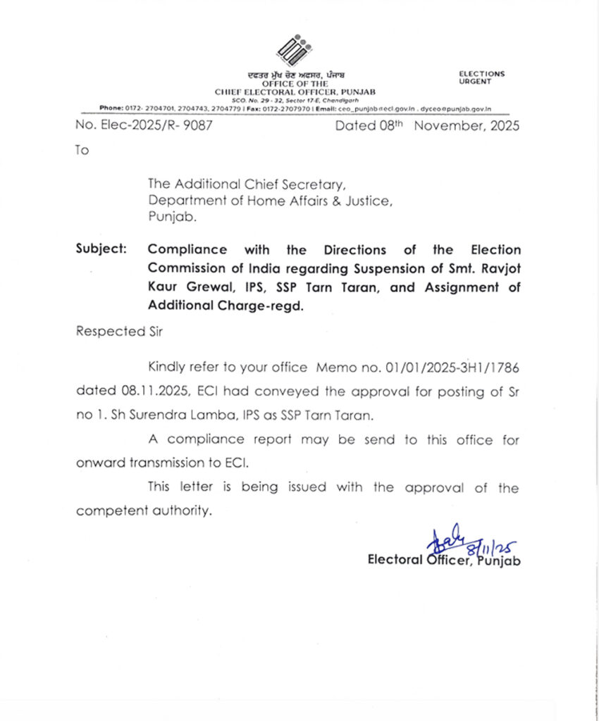 तरनतारन में होने वाले उपचुनाव को लेकर सियासत गरमाई हुई है। जहां पार्टियों के नेताओं द्वारा दिए जा रहे बयानों को लेकर मामला गरमा रहा है। वहीं तरनतारन की एसएसपी डॉ. रवजोत कौर ग्रेवाल पर गाज गिरने का मामला सामने आया है। दरअसल, चुनाव आयोग ने एसएसपी को तुरंत प्रभाव से सस्पेंड करने के आदेश जारी किए है। वहीं अमृतसर के गुरप्रीत सिंह भुल्लर को एडिशनल चार्ज सौंपने के आदेश जारी किए गए है।