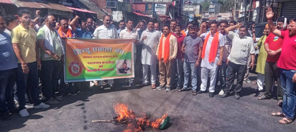 ऊना/सुशील पंडित: जम्मू-कश्मीर के पहलगांव में हाल ही में हुई भयावह आतंकी घटना, जिसमें 28 निर्दोष लोगों की जान चली गई, के विरोध में शनिवार को बंगाणा व्यापार मंडल ने बाजार पूर्ण रूप से बंद रखकर दुकानदारों ने व्यापार मंडल अध्यक्ष विनोद सेंटी की अध्यक्षता में रैली निकालकर अपना रोष प्रकट किया। इस दुखद घटना के खिलाफ एक बड़ी रोष रैली का आयोजन भी किया गया। इस। रोष रैली में कुटलैहड़ भाजपा के वरिष्ठ नेता एवं पूर्व विधायक दविंदर भुट्टो के साथ बड़ी संख्या में स्थानीय व्यापारी आम नागरिक शामिल हुए। बही बंगाणा चौक पर पाकिस्तान का पुतला जलाकर दुकानदारों ने पाकिस्तान मुर्दाबाद के नारे लगाए।