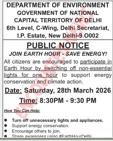 नई दिल्लीः दिल्ली सरकार के पर्यावरण विभाग ने शनिवार 28 मार्च 2026 को पब्लिक नोटिस जारी किया है। ऐसे में आज शाम 8:30 बजे से 9:30 बजे तक दिल्लीवासियों को अनावश्यक लाइट्स और गैजेट्स बंद रखने की अपील की गई है। दरअसल, भारत की वीरता, बलिदान और गौरव की पहचान प्रमुख स्थल इंडिया गेट पर आज रात एक घंटे बिजली गुल रहेगी। ऐसा इसलिए क्योंकि ‘अर्थ ऑवर’ मनाया जाएगा। वैश्विक आंदोलन ‘अर्थ ऑवर’ की 20वीं वर्षगांठ के अवसर पर दिल्लीवासियों को ये नजारा देखने को मिलेगा।