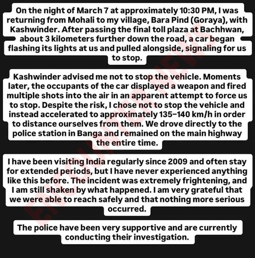 सिंगर ने सोशल मीडिया पोस्ट में लिखा- 7 मार्च की रात लगभग साढ़े 10 बजे मैं मोहाली से अपने गांव बड़ा पिंड (गोराया) लौट रहा था। उस समय कशविंदर मेरे साथ था। बछवां में आखिरी टोल प्लाजा पार करने के बाद सड़क पर लगभग 3 किलोमीटर आगे एक कार की लाइट हमारी ओर चमकाना शुरू हुई। उसमें बैठा व्यक्ति लाइट चमकाकर हमें रुकने का इशारा कर रहा था और खुद सड़क किनारे पर आकर रुक गया।