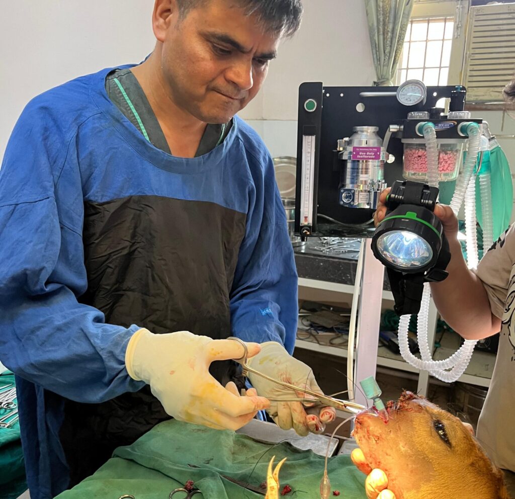 डॉ. मनोज शर्मा ने बताया कि घायल सांभर ऊना के आसपास के जंगलों में पाया गया था। किसी जंगली जानवर द्वारा हमला किए जाने से उसका पूरा जबड़ा, दांतों सहित हड्डियां भी बुरी तरह से क्षतिग्रस्त हो गई थीं। स्थानीय लोगों की सूचना पर वन विभाग ने त्वरित कार्रवाई करते हुए राधा माधव गौशाला की मदद से इस घायल जानवर को बहुआयामी पशु चिकित्सालय, लालड़ी में लाया। स्थिति की गंभीरता को देखते हुए, डॉ. शर्मा ने इसे आपातकालीन स्थिति घोषित करते हुए तत्काल प्लास्टिक सर्जरी का निर्णय लिया। अत्यधिक रक्तस्राव और श्वसन अवरोध के चलते यह सांभर जीवन और मृत्यु के बीच झूल रहा था।